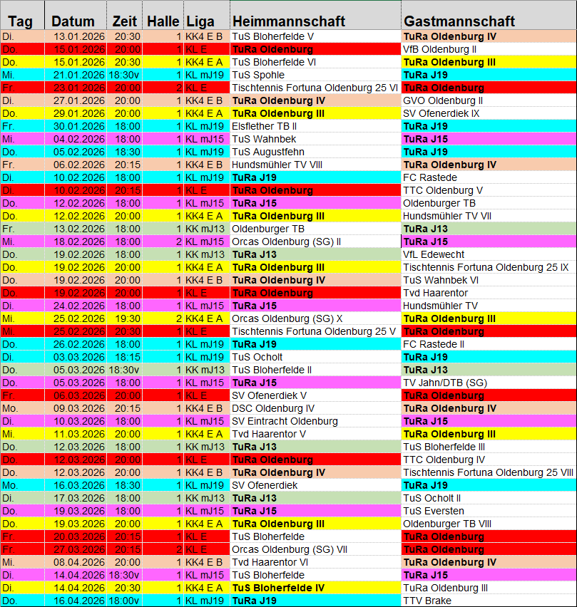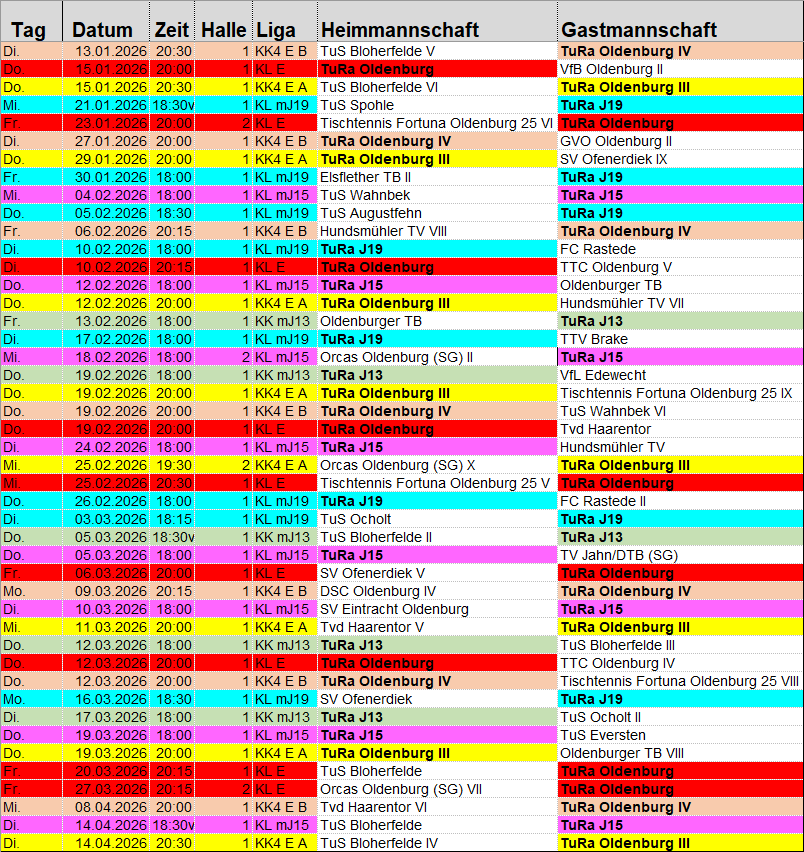 Punktspielbetrieb Tura-Pins_Codes für alle Mannschaften (Stand 11.02.2026)! Gesamtspielplan TURA76 Rückrunde 2025-2026(Stand 16.02..2026)